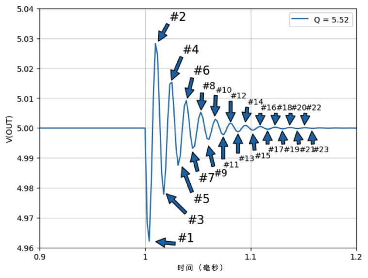 SEPIA方法利用了这样一个假设:任何作为滤波器的电路在应对阶跃负载时都会表现出相似的振铃特征。如果它们具有相同的品质因数(Q),只要底层系统表现出二次行为,它们就会显现相同的振铃特征。以图1为例,该图由下文所述之仿真生成;其中,在Q值为5.52的情况下,它产生了20个易于检测的振铃峰值。系统设置的差异会导致振铃频率、幅度和直流偏置的不同。但是,所有Q值为5.52的系统都将具有相同数量的峰值及相同的衰减率。