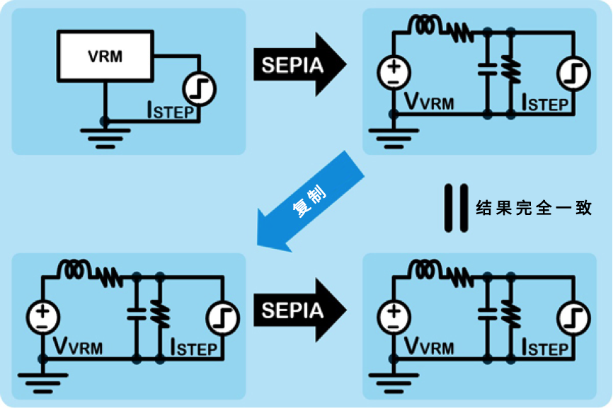 为验证基于SEPIA技术的准确性,我们可以使用一对仿真实验来进行验证。这两个VRM仿真实验模型具有等效结构并且可以用二次方程建模,但阻尼电阻的位置不同。如图2所示,通过将第一次SEPIA分析的结果输入到第二次SEPIA处理中,我们可以确认两个结果完全一致,因此证明该技术如预期般有效。