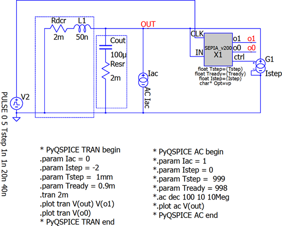 仿真平台的输出是已准备好运行的QSPICE的输入文件。它们所含的电路模型完全相同,但使用了不同的QSPICE仿真指令:“.TRAN”或“.AC”;我们能够看到它们之间是如何比较的。想要了解详情的读者,可以参考会话文件。