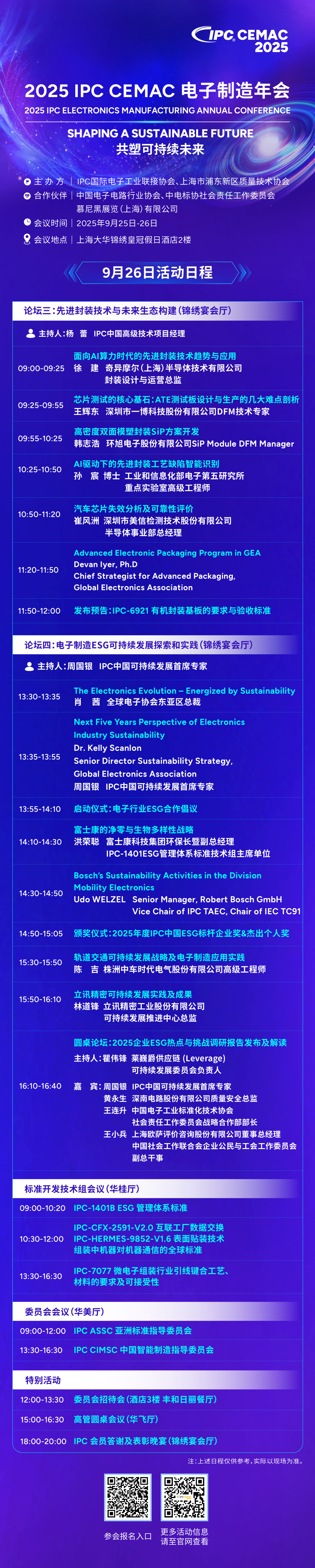 2025 IPC CEMAC电子制造年会将于9月25日至26日在上海举办。年会以“Shaping a Sustainable Future(共塑可持续未来)”为主题,汇聚国内外专家学者、产业领袖与制造精英,围绕先进封装、新兴产业、PCB/PCBA技术、AI与数字化转型以及ESG可持续发展等热点话题展开深入探讨,推动电子行业的健康可持续发展。