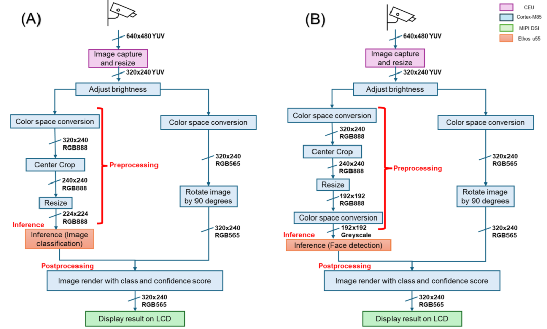 实际上,首次发布的RUHMI工具包中已经包含了两个用例,基于瑞萨官方的EK-RA8P1电路板,分别实现了人脸识别和图像分类两个模型在RA8P1芯片上的部署。设计程序的系统框图,如图7所示。