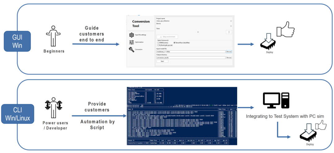 使用RUHMI对模型进行转换,有两种方式,命令行和图形用户界面。图形界面适合对模型转换器进行简单试用,对于资深开发者建议使用命令行方式,以使用更多功能的API,并方便集成至自动化工作流中。另外,命令行开发方式还可适用于Linux系统平台。如图6所示。