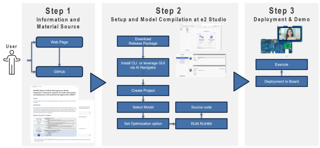 伴随着瑞萨新推出了集成了Ethos-U55 NPU和Arm Cortex-M85 CPU内核的全新高性能RA8P1微控制器,瑞萨提供了一套用于将常用AI模型部署到高性能计算平台的工具,以充分利用目标平台的硬件AI计算加速单元完成AI计算任务,这就是RUHMI。