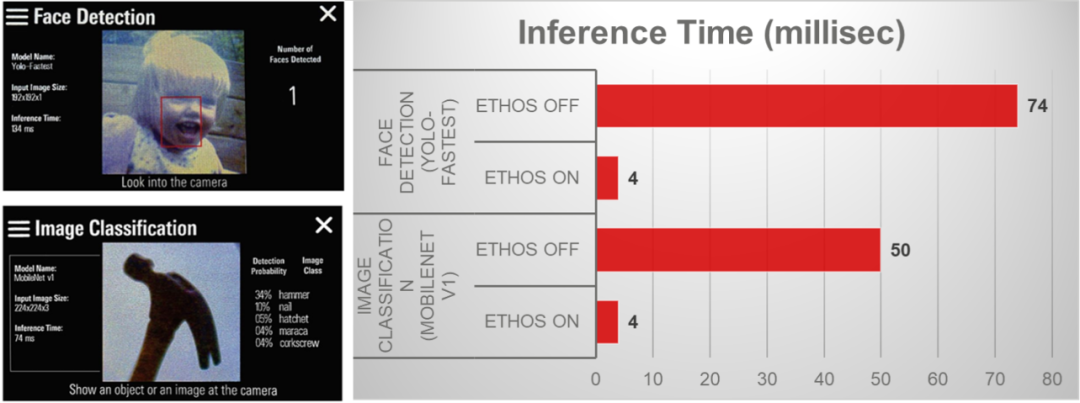 通过分别运行这两个用例,启用NPU(Ethos-U55)的情况下,相对于不使用NPU的,执行推理提速将近20倍。如图8所示。