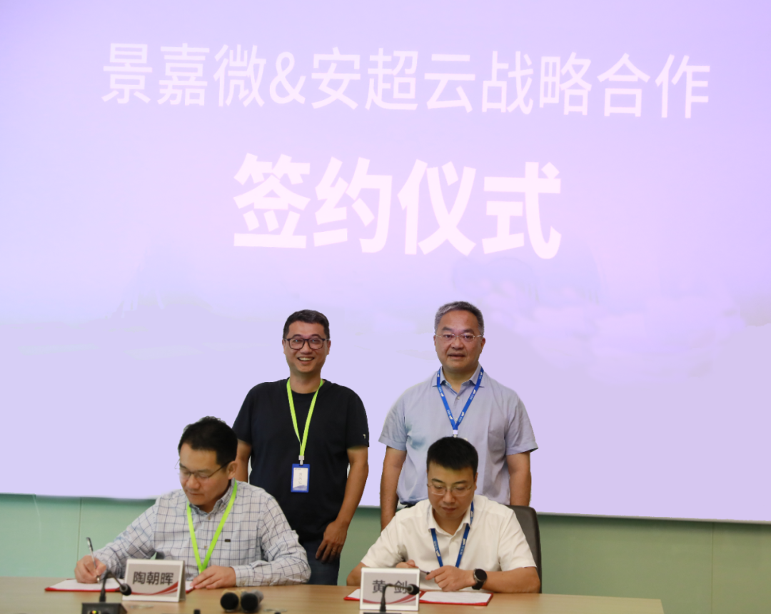 9月11日上午,长沙景嘉微电子股份有限公司(简称“景嘉微”)与安超云软件有限公司(简称“安超云”)在景嘉微公司会议室成功举行战略合作签约仪式。景嘉微董事长、总裁曾万辉,副总经理、芯片事业部总经理黄剑,安超云董事长郭晓,销售副总裁陶朝晖等双方代表共同出席。