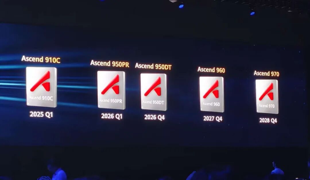 根据路线图显示,华为在今年一季度已经推出了昇腾910C。后续将在2026年第一季度推出全新的昇腾950PR芯片,四季度推出昇腾950DT。2027年四季度,华为将推出昇腾960芯片,2028年四季度推出昇腾970芯片。
