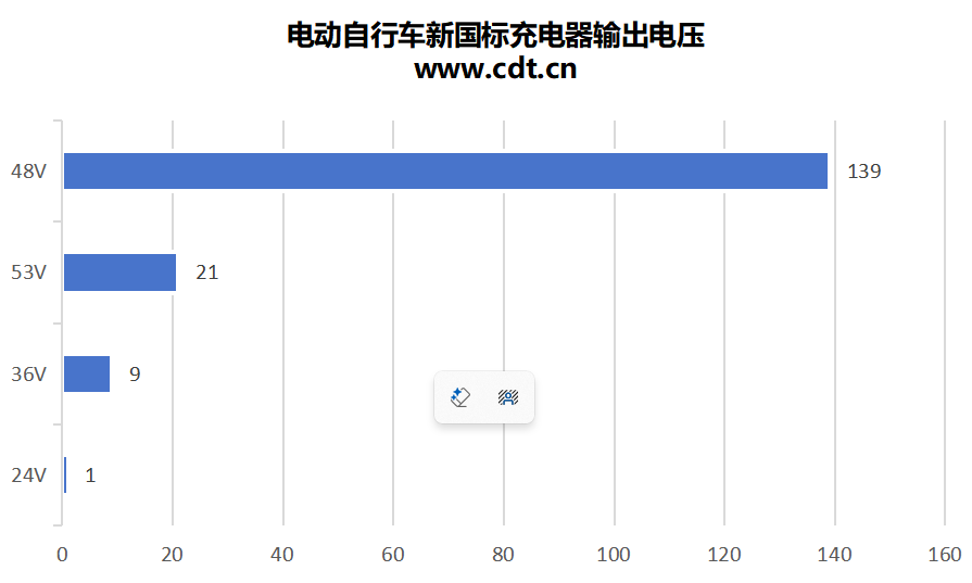 在通过新国标3C认证的电动自行车用充电器中,其输出电压大致可分为53V、48V、36V、24V四种,所占比例分别为12%、82%、5%和1%。