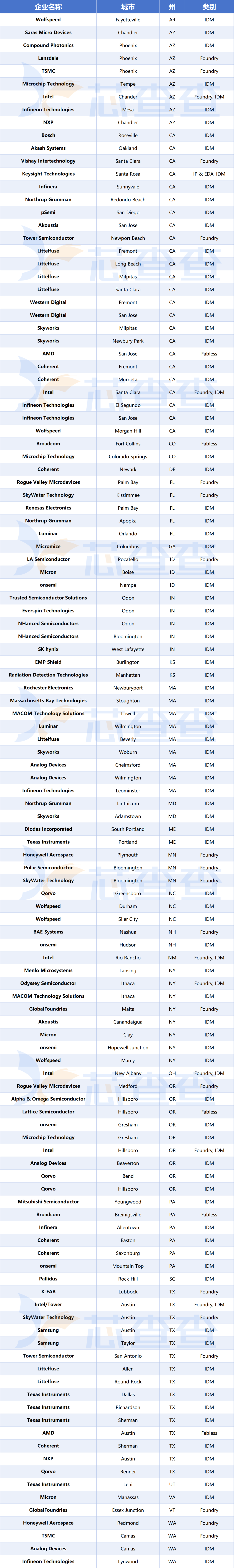除了上面提到的这些厂商,还有不少IDM和Foundry厂商都有在美国布局晶圆厂,比如Wolfspeed、Diodes、Littelfuse、Polar Semiconductor、LA Semiconductor、Odyssey Semiconductor等,具体可以参见下表,也可以到芯查查SaaS页面了解更多全球晶圆厂分布和产能信息。