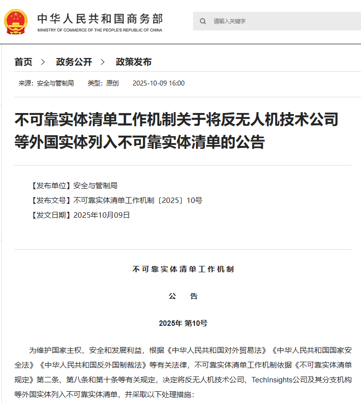 10月9日,商务部网站发布不可靠实体清单工作机制关于将反无人机技术公司等外国实体列入不可靠实体清单的公告。