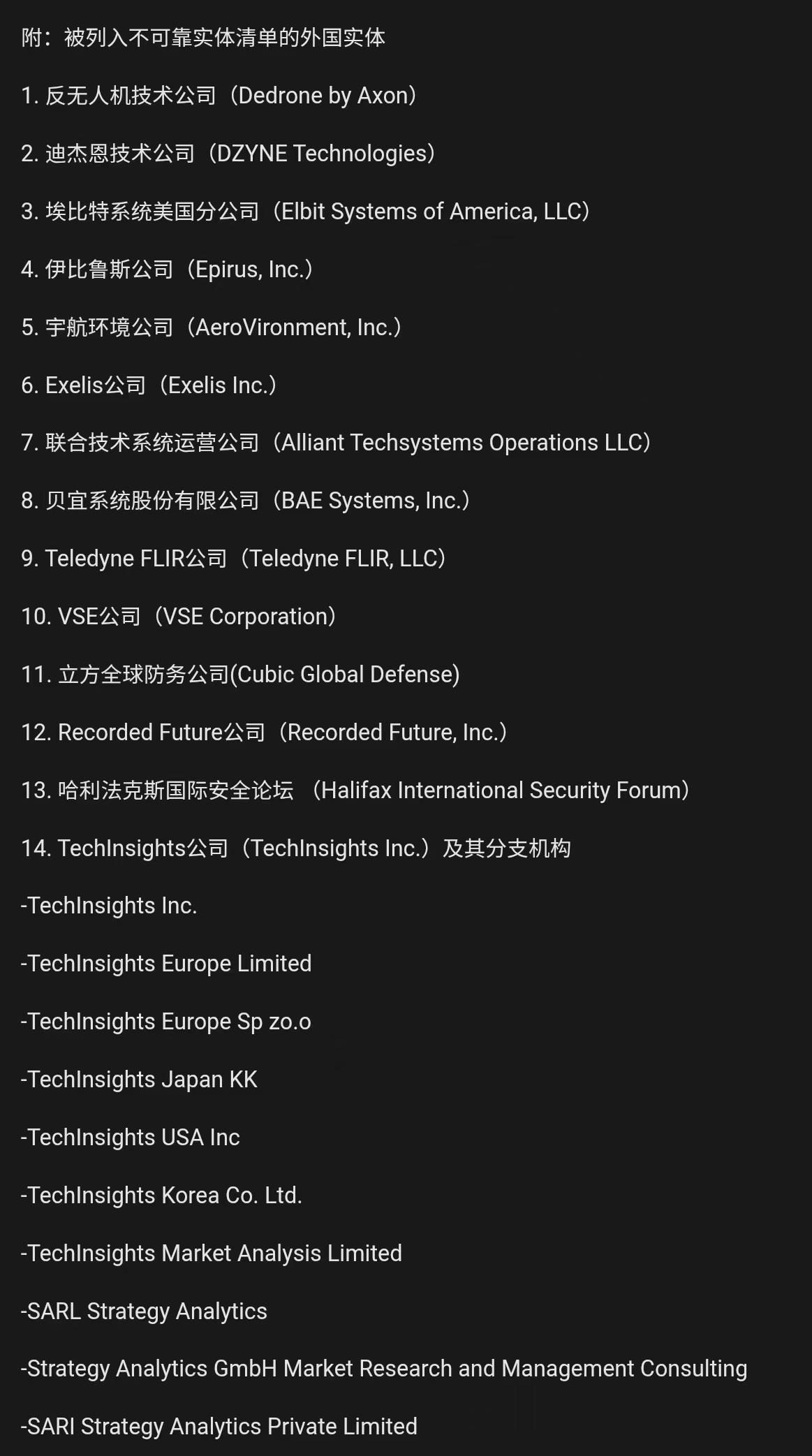 公告称,为维护国家主权、安全和发展利益,根据《中华人民共和国对外贸易法》《中华人民共和国国家安全法》《中华人民共和国反外国制裁法》等有关法律,不可靠实体清单工作机制依据《不可靠实体清单规定》第二条、第八条和第十条等有关规定,决定将反无人机技术公司、TechInsights公司及其分支机构等外国实体列入不可靠实体清单,并采取以下处理措施: