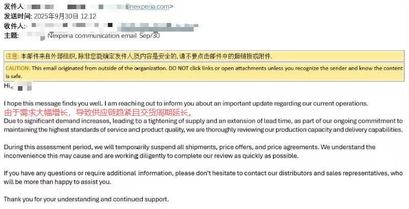 9月30日,据闻泰科技向客户发布的业务调整通知,宣布因市场需求显著增长导致供应紧张,将暂停短期发货、价格报价及价格协议,同步启动生产与交付能力全面审查。