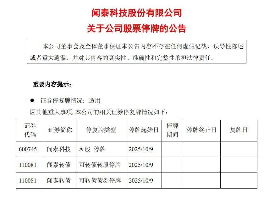 10月9日,闻泰科技公告,近期闻泰科技股份有限公司因存在尚未披露的重要信息,为保证公平信息披露,避免公司股价异常波动,维护广大投资者利益,根据《上海证券交易所上市公司自律监管指引第4号——停复牌》相关规定,经公司向上海证券交易所申请,公司股票及可转换公司债券自2025年10月9日(星期四)开市起停牌,预计停牌时间不超过2个交易日。停牌期间,公司可转换公司债券“闻泰转债”将暂停转股。