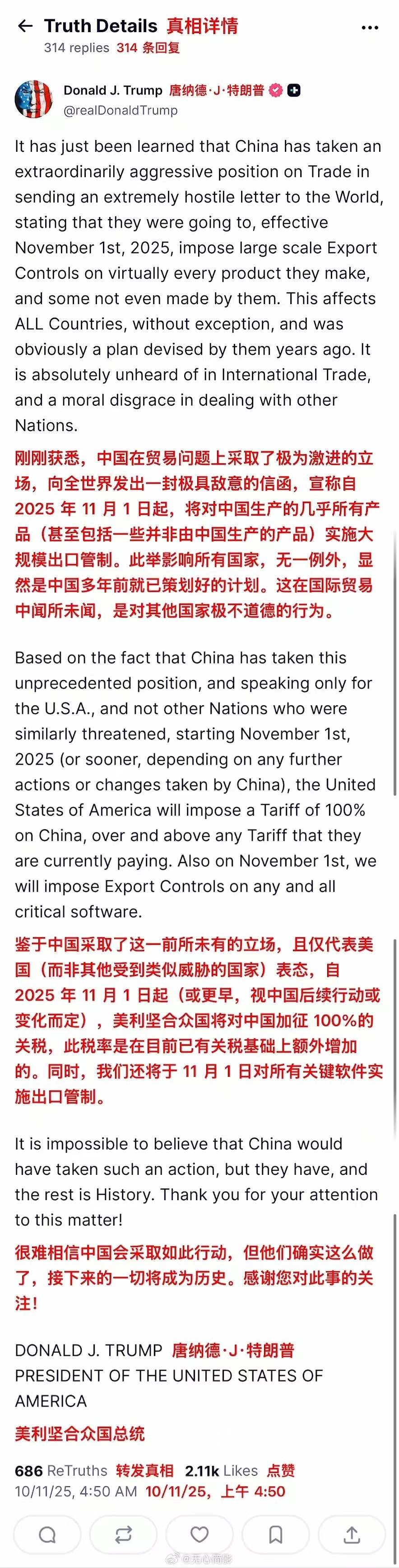 当地时间2025年10月10日,美国总统特朗普在社交媒体上宣布:从11月1日起,对中国产品征收100%关税;并对所有关键软件实施出口管制。理由是,中国在10日9日发布对相关稀土实施出口管制的决定。