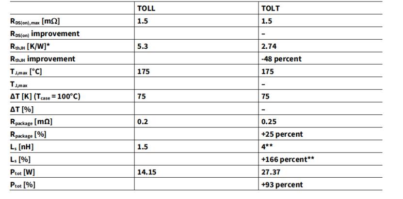 可以发现和TOLL封装相比较,TOLT最大的改进在于热阻降低非常明显整体耗散功提升超过90%以上。