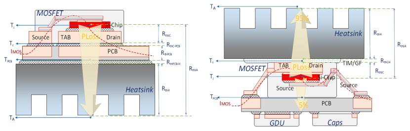 2,消除PCB和焊料互连来缩短散热通路,对MOSFET的性能提升具有显著影响。有实验对这两种方案进行了研究,结果显示:即使采用传统方案,使用FR4型PCB时,从结区到散热器的总热阻仍可至少降低20%。对于研发工程师而言,这意味着要么在相同功率应用下节省冷却系统成本,要么通过相同系统架构实现更高功率输出。