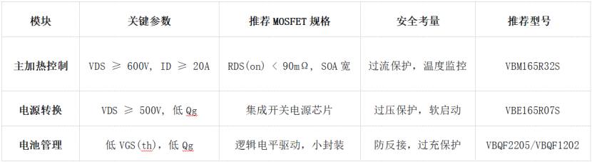 在不同电路模块中,MOSFET的参数选择各有侧重。以下是养生壶主要功能模块的MOSFET需求分析: