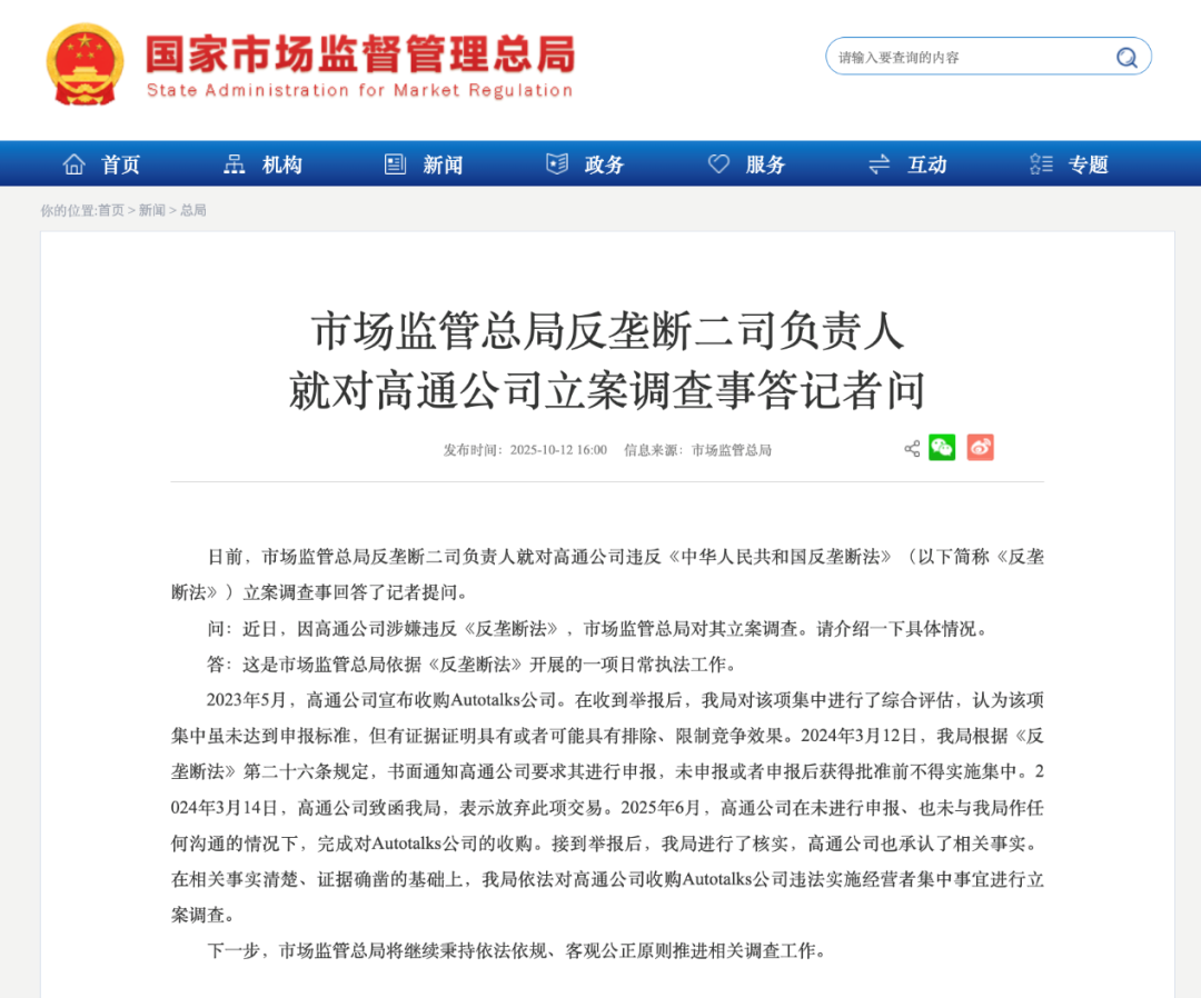 2025 年 10 月,接到举报后,市场监管总局进行了核实,高通公司也承认了未申报收购的相关事实。在相关事实清楚、证据确凿的基础上,市场监管总局依法对高通公司收购Autotalks公司违法实施经营者集中事宜进行立案调查。