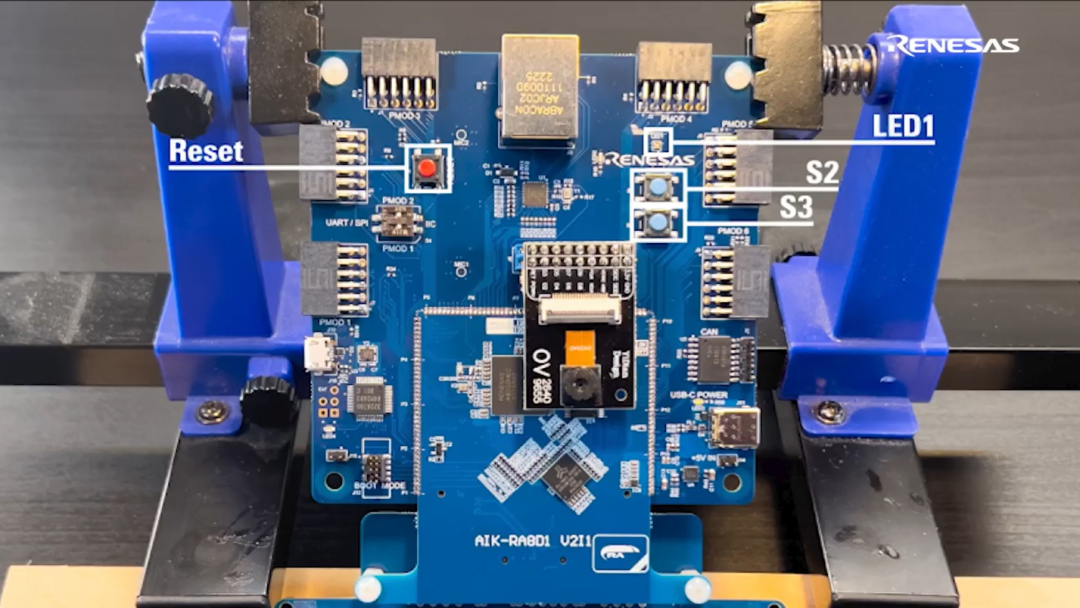 首先,在瑞萨RA8D1微控制器上加载Aizip的人脸识别程序。开发板上有三个按钮,左侧是代表重置键的红色按钮,右侧是两个蓝色按钮,分别为按钮S2和按钮S3。在按钮S2的上方有LED1指示灯。如图1所示。