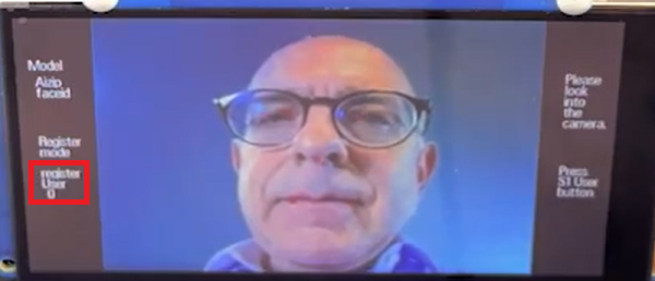 为了让系统能够识别特定的面部,需要进入录入模式。按下S3按钮,系统会存储当前的面部信息,此时屏幕的左侧显示“register User 0”,代表注册的第1个用户。如图3所示。