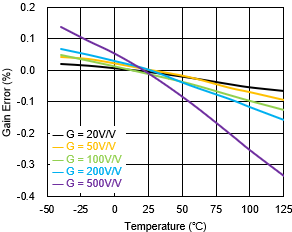 SGM830 拥有五种固定增益选项(20V/V、50V/V、100V/V、200V/V 和 500V/V),能够满足不同系统的灵活需求。该设备采用了一种精密的闭环架构,其增益由内部电阻网络决定。该网络在电阻之间实现了出色的比例匹配,同时允许更大的绝对值容差范围。这种设计确保了增益的高度稳定性和一致性。SGM830 内部增益电阻具有出色的温度稳定性,确保 SGM830A/B/C/D 的增益误差在全温度范围内保持在 ±0.4%,SGM830E 保持在 ±0.65% 之内,覆盖整个工作温度范围。