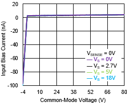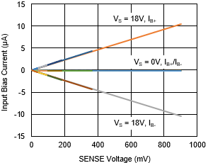 SGM830 输入端采用电容耦合斩波放大器结构,实现了极低的输入偏置电流 IB(典型值 25nA,VSENSE = 0V),即便在共模电压高达 80V 的情况下也是如此。这种极低的电流消耗使得在对泄漏电流要求极低的应用中能够实现高度精确的电流测量。