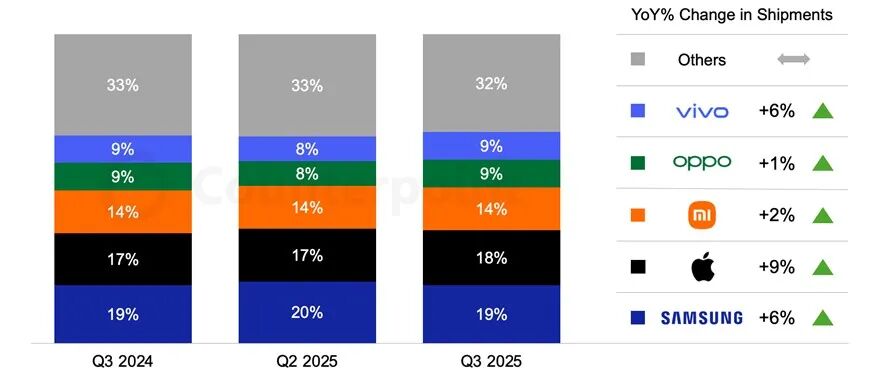 在亚太地区(APAC)和中东非地区(MEA)的强劲表现拉动下,2025年Q3全球智能手机市场出货量同比增长4%。