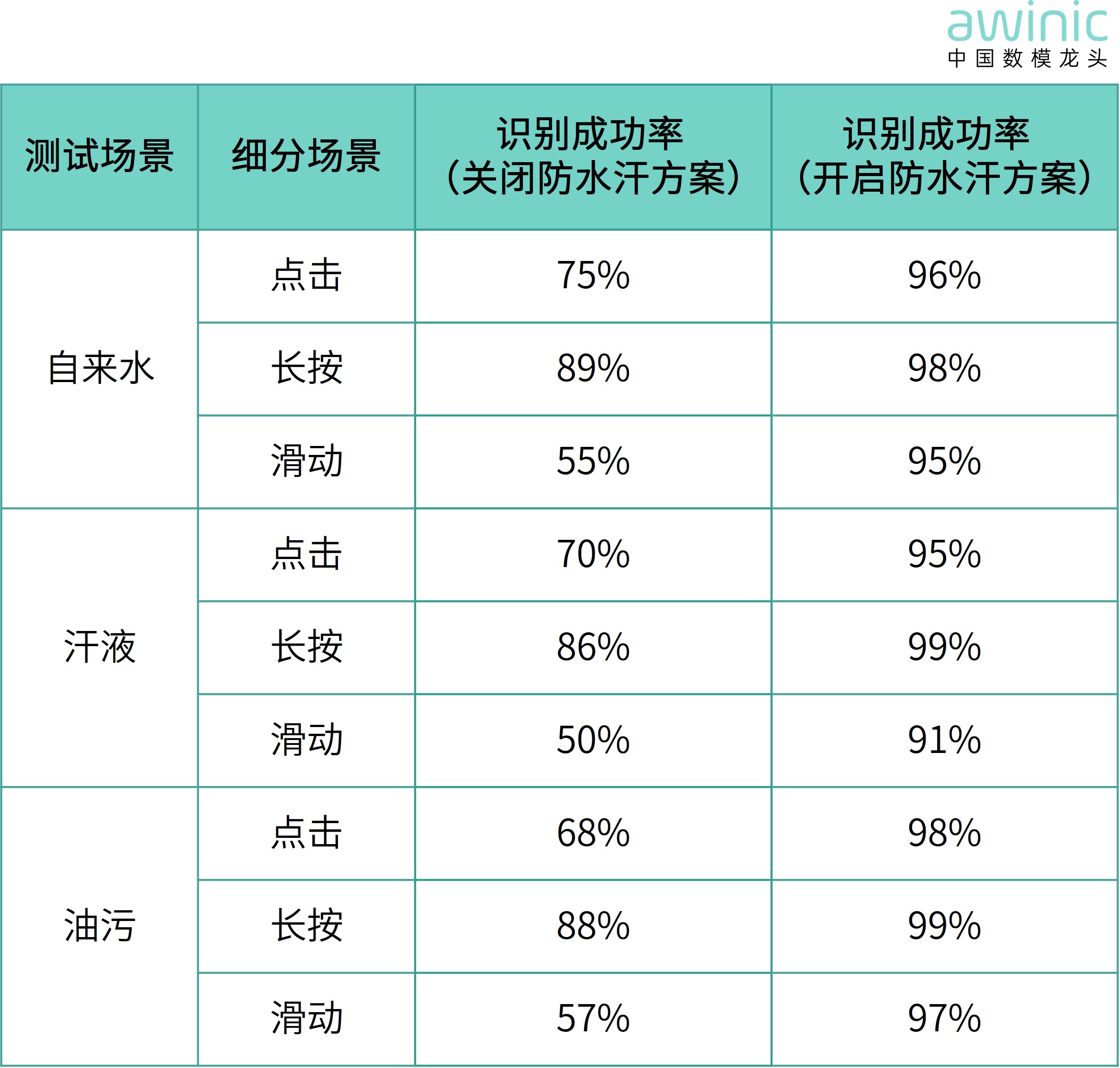 水汗场景的误触发是工业和消费类应用中常见的痛点,常规的电容式的按键和滑条,水汗附着会引起信号量变大,从而引起按键误触发或者滑条坐标异常。AW933XX内置“大禹”防水防汗算法,配合自互容一体检测前端,能够抑制水汗影响,日常带自来水、汗液、油污滑动和点击识别综合成功率可达95%以上。