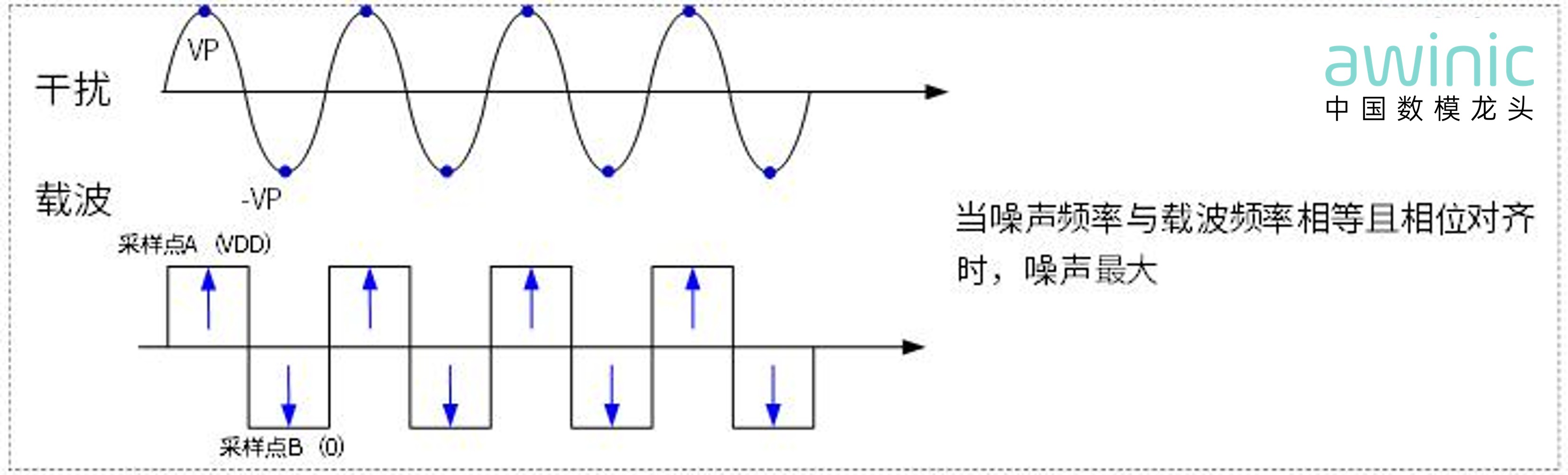 干扰信号频率是芯片电容采样载波频率的奇数倍时,电容检测信号量抖动加剧,产生异常高信号,从而引起电容检测系统误触,表现为误报按键状态,滑动坐标异常偏移或误报异常佩戴状态。