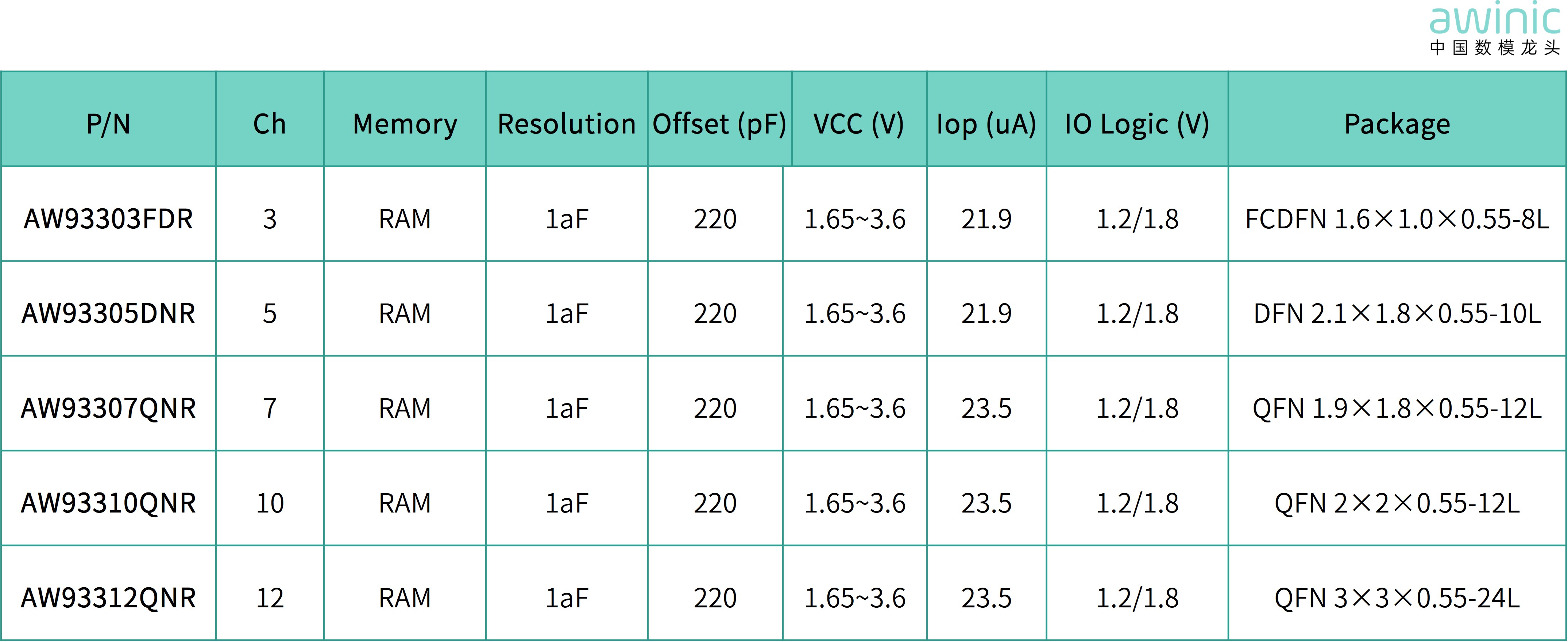 AW933XX系列覆盖3/5/7/10/12通道电容触控应用,具有1aF电容检测精度,能自动抵消220pF以内的负载电容。
