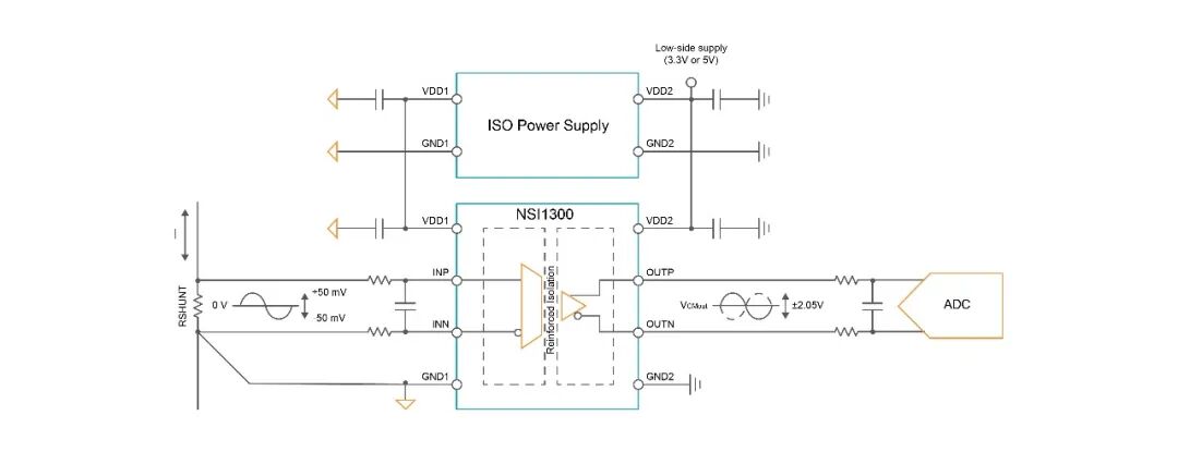 在一些浮地采样的场景下,使用上一代产品NSI13xx系列的客户需要额外设计隔离电源给高压侧供电,而NSI36xx全系列产品均集成了隔离DC-DC电源,这一设计为客户带来了显著的实用价值: