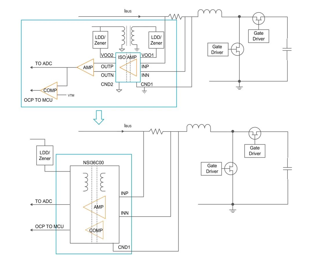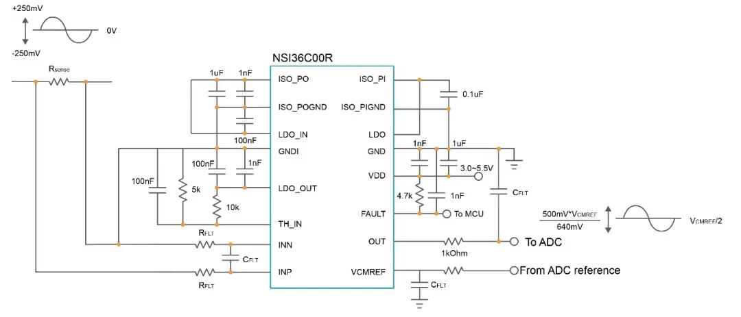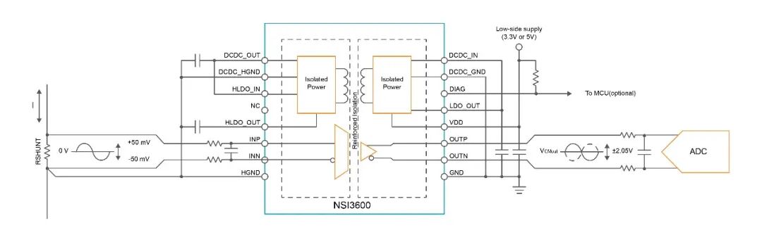✔ 简化供电设计:传统的隔离采样方案需要为高压侧和低压侧分别供电,而NSI36xx系列只需在低压侧提供单一电源即可正常工作,省去了复杂的高压侧供电电路。这不仅减少了电源设计复杂度,还显著缩短了开发周期。