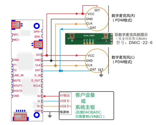 - 模式十二(双麦波束 + USB):接入双数字麦(PDM 格式),开启单波束 / 双波束拾音,通过 USB 传输音频,适合远程会议设备(聚焦发言人)、双分区翻译机(隔离左右声道)。
