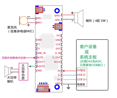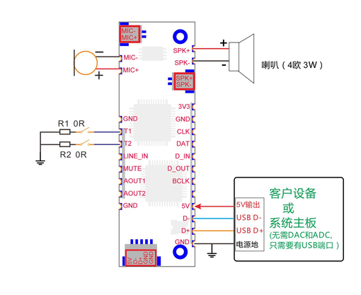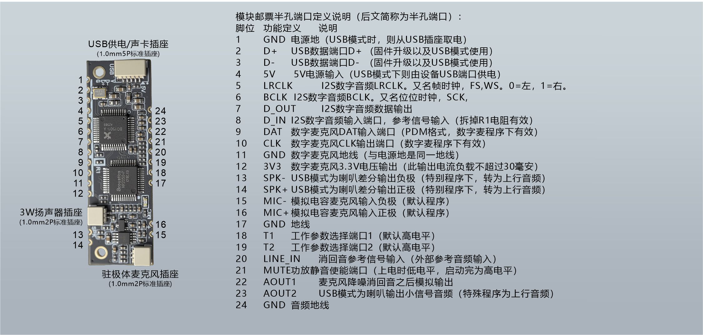 - 模式二(单模拟麦 + SMT 焊接):将模组焊在主板上,替代原音频电路(含功放),适合新设备开发(如安卓核心板、工控设备),减少音频调试工作量。