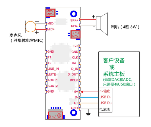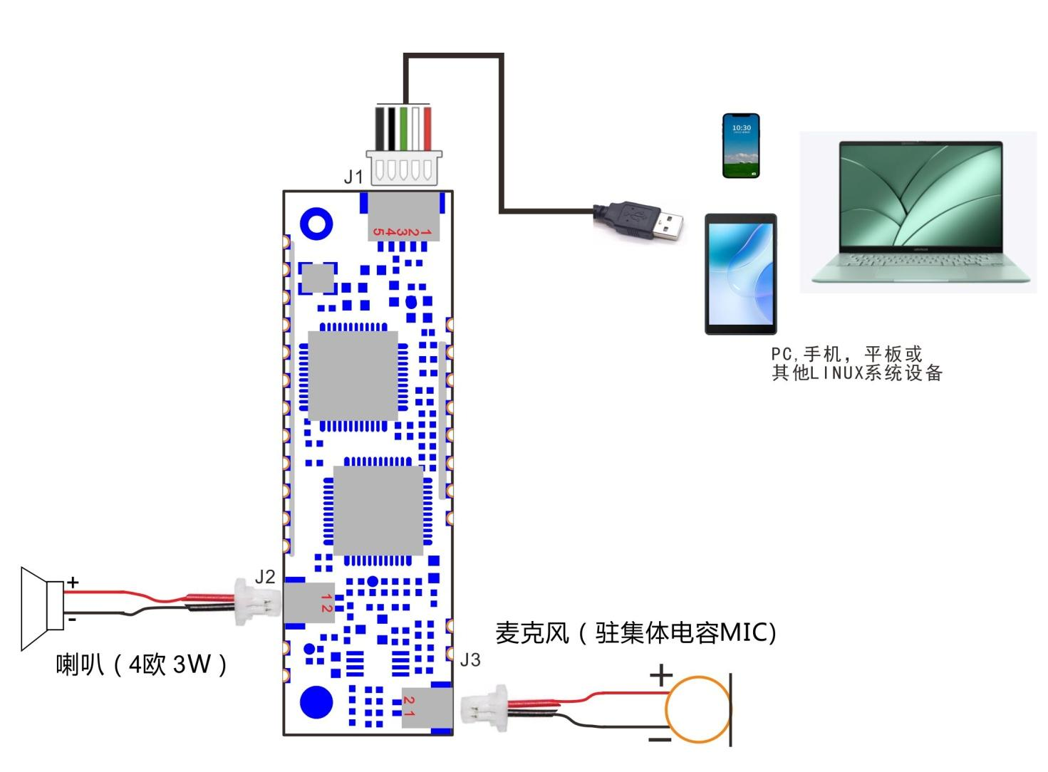 - 模式一(单模拟麦 + USB 端子):通过 J1(USB)、J2(喇叭)、J3(模拟麦)端子连接,免驱接入电脑 / 平板,5 分钟完成调试,适合智能门禁、家用监控等成品设备升级。