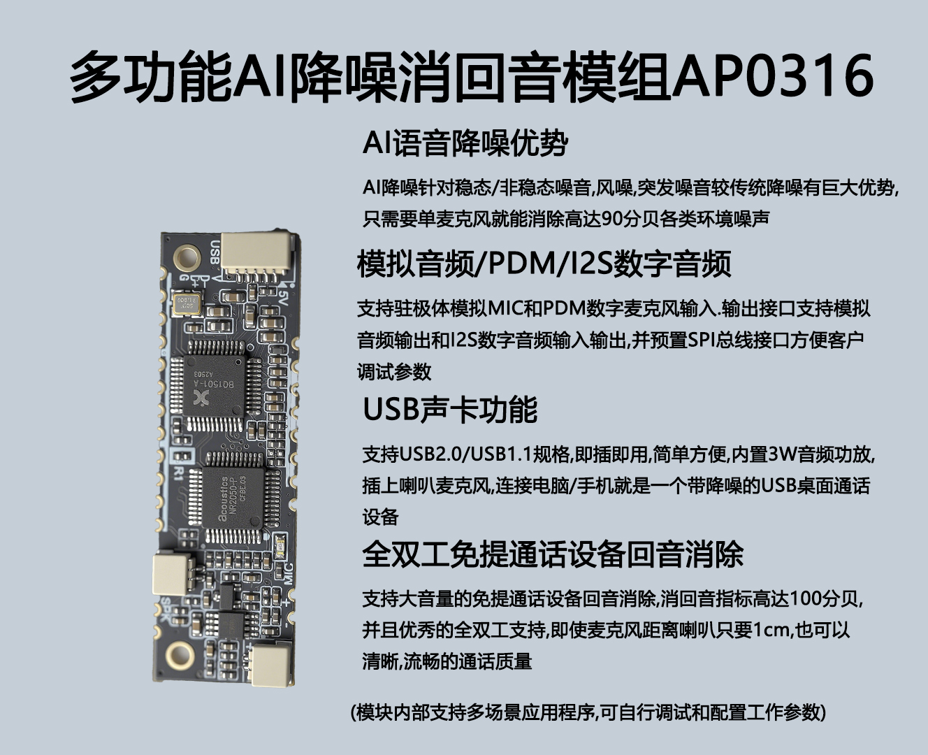 AP-0316 以 “AI 降噪 + 双麦波束” 解决语音交互核心痛点,以 “USB 即插即用 + 自带功放” 简化开发,再通过丰富接口和模式覆盖从家庭到工业的全场景。无论是设备厂商升级产品,还是开发者快速搭建语音系统,AP-0316 都能提供 “性能 + 便捷” 的双重保障,让清晰语音交互触手可及。