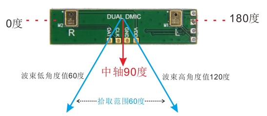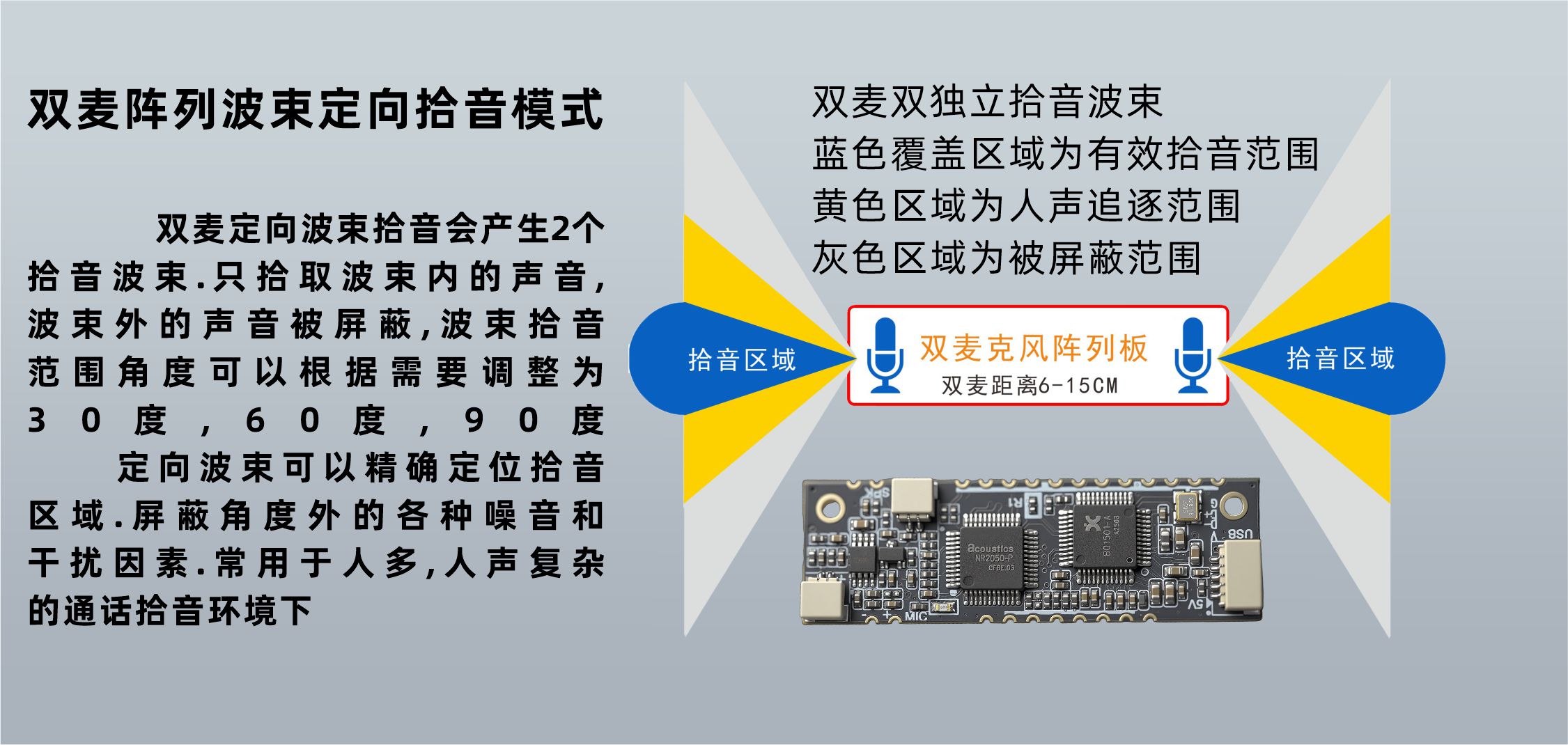 - 双波束模式:两个独立中轴角度(如 0° 和 180°),双声道输出,适合双分区通话(如智能翻译设备、双区域监控)。
