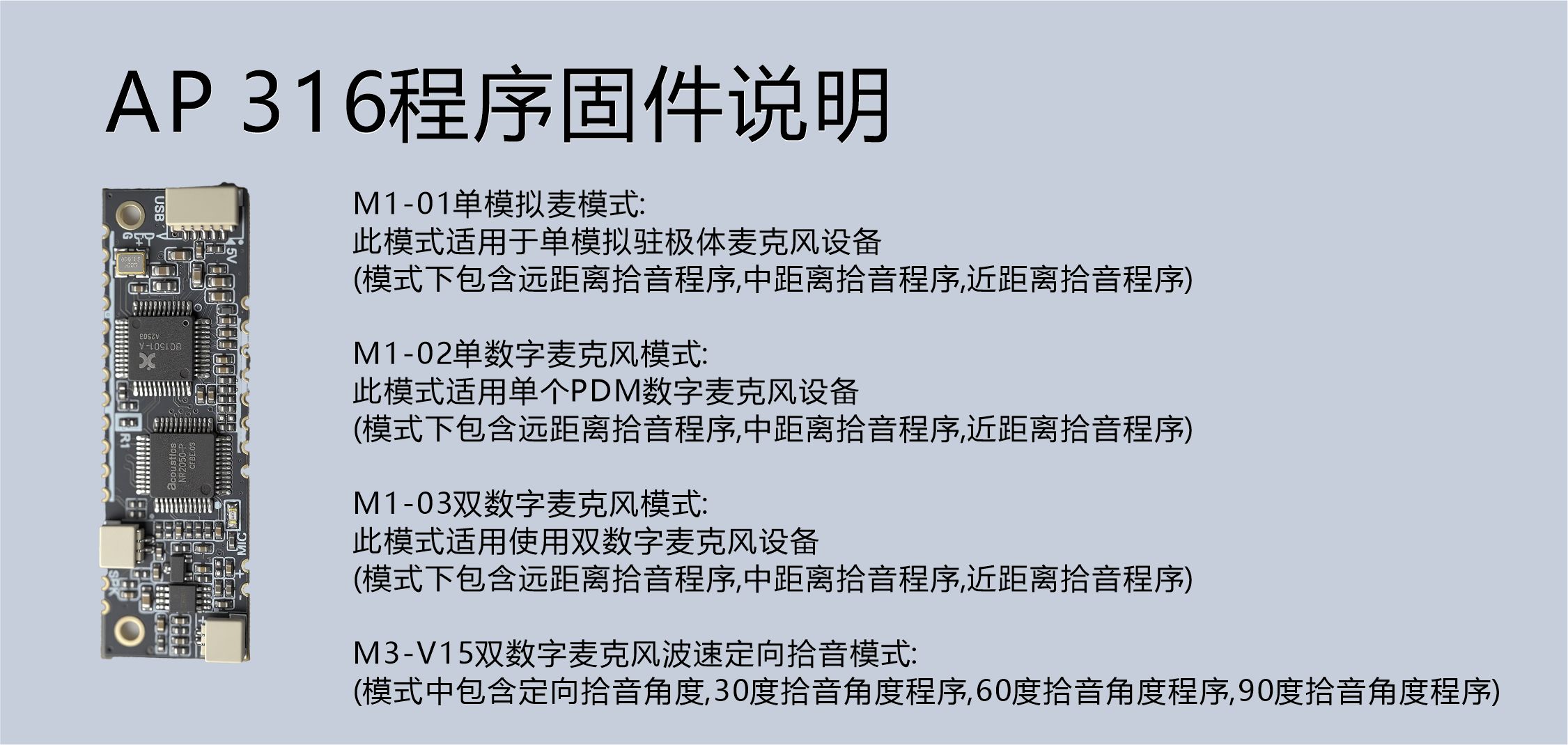 - 固件类型:不同固件对应功能(如单麦 / 双麦模式、波束开关),可联系厂商获取定制版本;