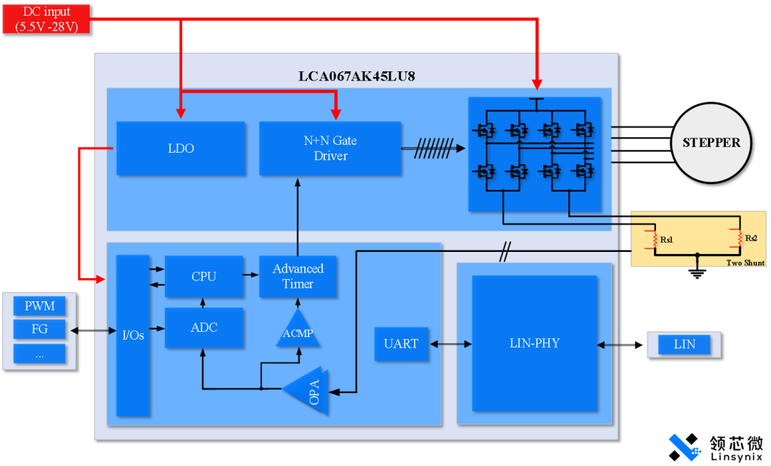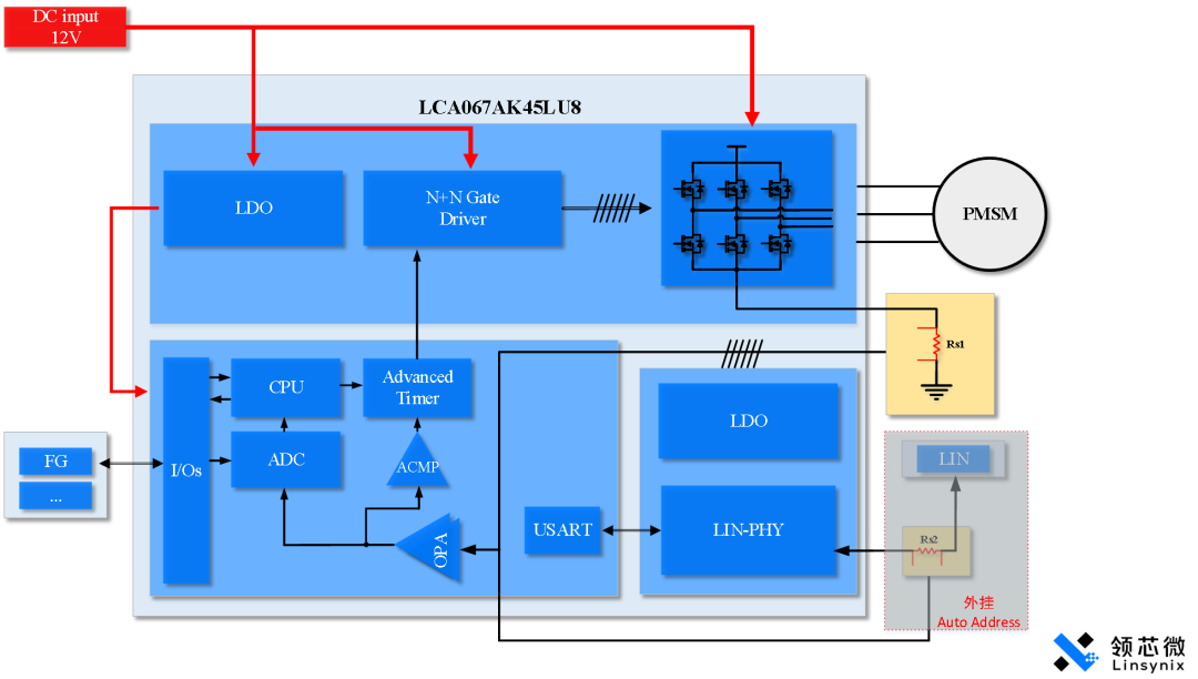 领芯微电子推出一款32位内核的面向汽车电子应用的SOC产品——LCA067AK45LU8。集成LIN PHY,集成6相NN MOS,可灵活配置为3相或者4相工作模式,可直接驱动三相电机绕组,以及步进电机,并通过AEC-Q100 Grade1认证。