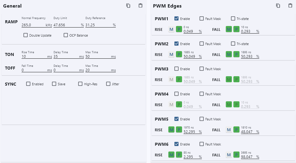 HP1000内置非常丰富的配置选择,支持多种PWM输出类型、时序配置、环路配置、输出电压配置、工作频率、占空比、死区、保护点、保护方式等。无论是为工业控制模块供电,还是为通信基站的核心设备提供稳定电源,工程师无需从零开始编写驱动代码或控制程序,只需根据实际需求进行简单的GUI参数配置,即可快速集成配置到HP1000芯片中,显著降低重复开发的时间与资金成本。
