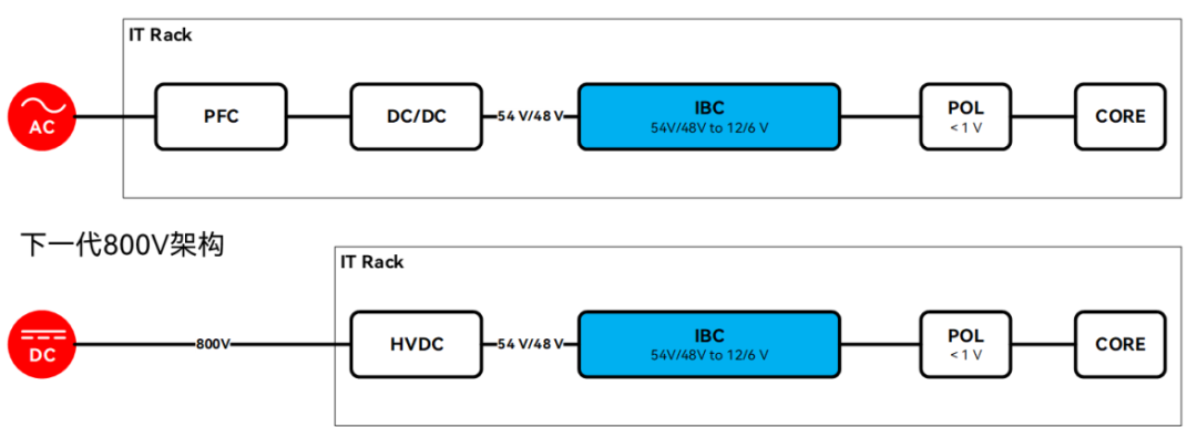 随着处理器核心的性能提升,加上数据中心越来越多传统AI数据中心采用54 V低压直流架构,在应对兆瓦级机柜功率时,会因电流过大而产生高昂的电阻损耗,并导致铜缆线径粗、用量大,在经济性和实用性上均面临挑战。为此,NVIDIA提出转向800 VDC直流配电系统。该新架构从传统的415 VAC或者480 VAC交流电转向构建端到端的800 VDC直流母线,省去了中间多余的交直流转换环节,直接将高压直流电输送至计算节点。此举不仅显著降低了传输损耗,相比传统多级转换方案,还能节省高达26%的空间。