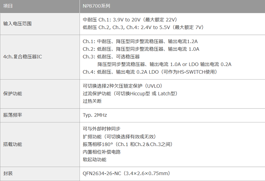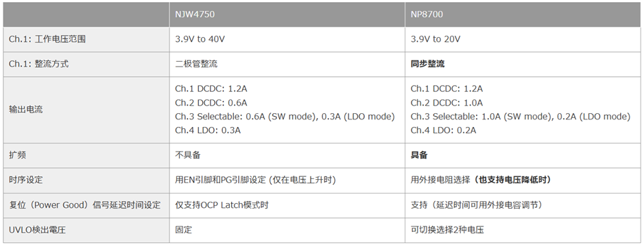 NP8700 将Ch.1的降压稳压器从以往的NJW4750的二极管整流方式变更为同步整流方式,从而减少了元件数量。并且,通过重新设计输出电流规格,可以支持更广泛的应用。此外,由于备有扩频功能对EMI 性能的改善和应对电压降低时序设定,进一步提高了设计灵活性和易用性。