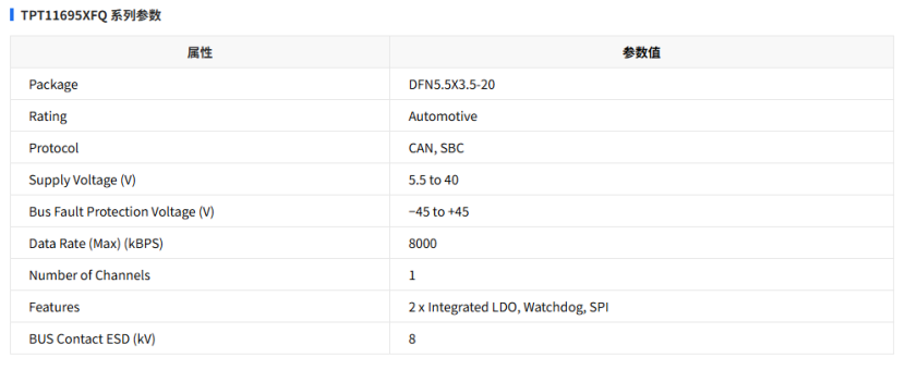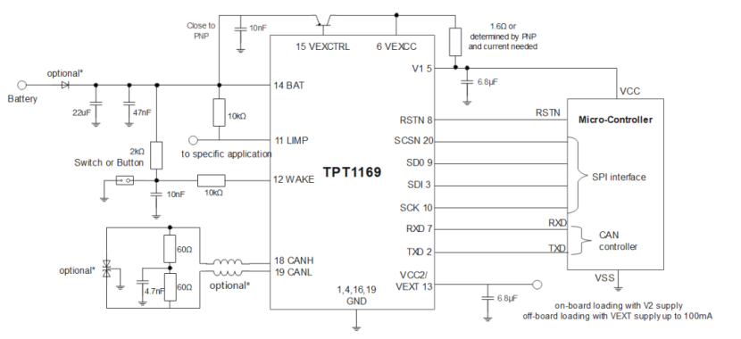 - 灵活的控制与诊断:TPT1169xQ支持16位、24位和32位SPI接口,方便MCU对其进行配置、控制和诊断,适应不同应用场景的需求。芯片集成了多种唤醒机制,包括本地唤醒、远程总线唤醒和选择性唤醒,并具备唤醒源识别功能,有效降低系统在休眠或待机模式下的功耗。