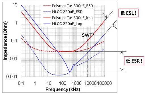 (a)阻抗,ESR与频率的关系。图中的Polymer Ta是聚合物钽电容器,SWF指开关频率。