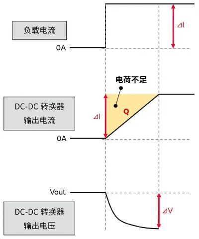负载瞬态是观察负载电流变化引起的电压波动幅度。在电流突然增加的情况下,DC-DC转换器无法瞬时响应。同时,会产生不足的电荷“⊿Q”。此时,输出电容暂时放电电荷以赶上电流的增加。当输出电压因放电而瞬时下降时,观察到电压降“⊿V”。