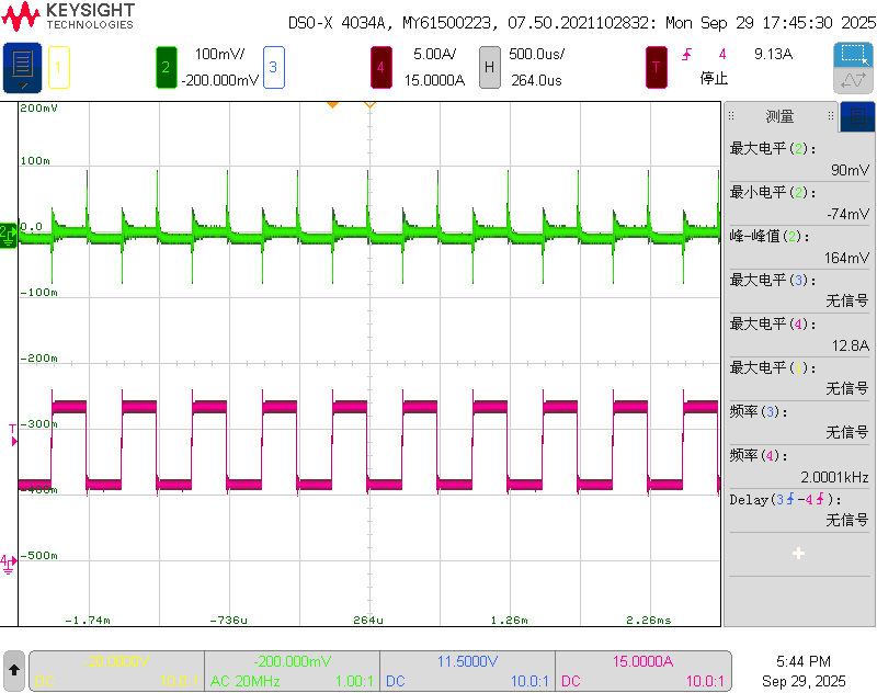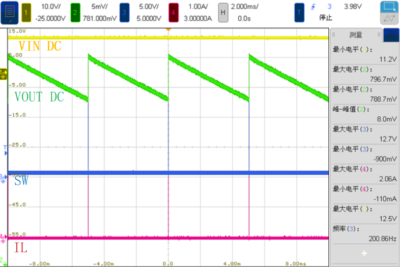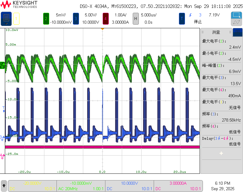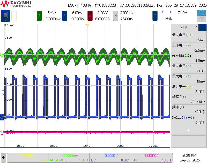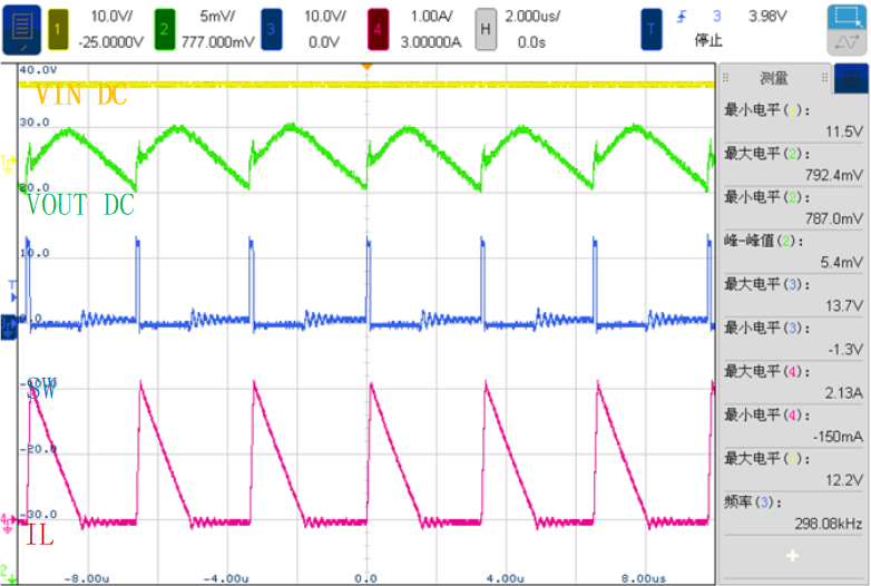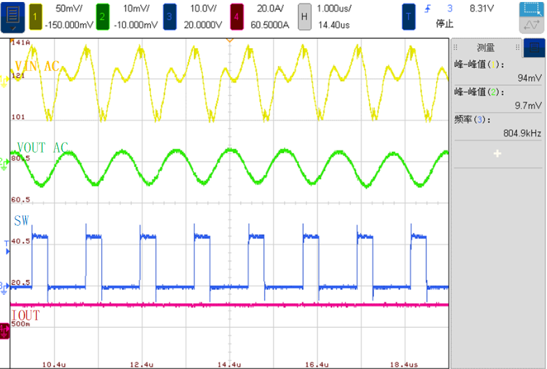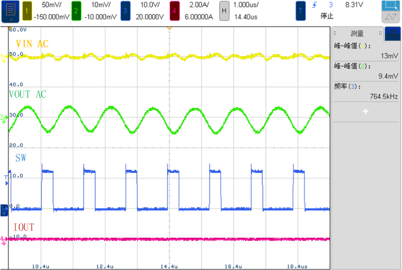 SGM611A13 采用 COT 架构,配合独特的 Ramp 电路,使得系统具有非常高的稳定性。无论是 PSM 模式还是 FCCM 模式, 开关波形都十分丝滑;双脉冲现象是没有的,输出电压纹波稳稳控制在 10mV 以内。下面图 2 波形展示了单次触发下的输出电压纹波,通过不同波形的角度例如 VOUT AC、VOUT DC、IOUT、IL 等等,全方面展示了稳定的性能。图 3 波形展示了长时间积累下的输出纹波,经过长时间运行与波形捕捉,SW 发波依然稳定如故。