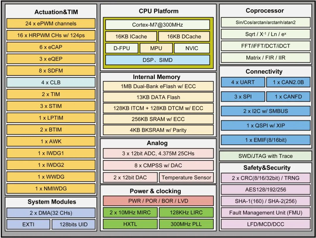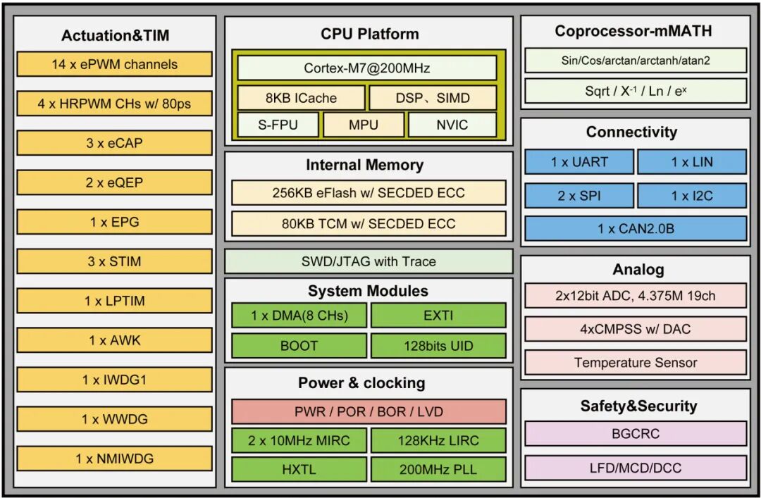 (3)外设:高端产品支持EtherCAT、CAN-FD等工业总线及更多ADC/PWM通道;中端产品支持CAN-FD,精简工业总线;高性价比产品仅保留SPI、UART等基础接口,满足中小功率场景需求。