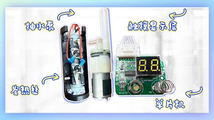 方案核心部件包括发热丝、抽水泵、触摸显示屏、单片机等,通过触控屏提供5档调温(25℃/45℃/65℃/85℃/99℃),并搭载双重温控开关与缺水保护,可实现多重安全防护。