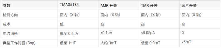 TMAG5134 集成式磁集中器的性能以及霍尔效应技术的制造成本可作为 AMR、TMR 和簧片开关的有力竞争对手,并显著降低了系统成本。