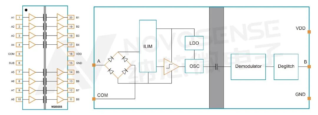 传统PLC依赖大量光耦器件实现信号隔离。纳芯微推出的多通道数字隔离芯片NSI860x(包括四通道的NSI8604和八通道的NSI8608)可将32路光耦集成至单颗芯片,不仅大幅节省了PCB面积,更将信号延迟从微秒级压缩至纳秒级。