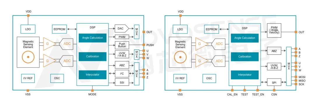 左:MT6701(SOP-8和QFN-16 封装)功能框图